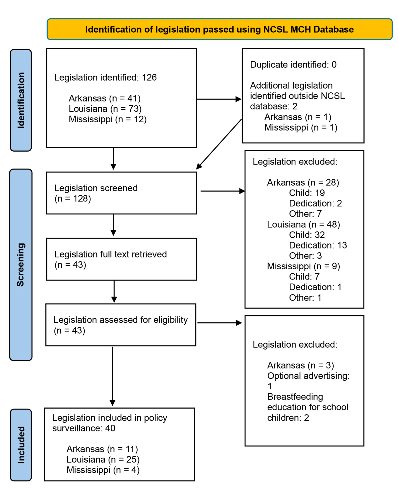 Between 2018 and 2023, 126 legislations were enacted in Arkansas, Louisiana, and Mississippi; 40 of those were related to maternal health. Most (n=25; 62.5%) bills were passed by the Louisiana legislature, followed by Arkansas (n=11; 27.5%) and Mississippi (n=4; 10.0%). Figure 1 shows the screening process using the modified PRISMA diagram, stratified by state.15