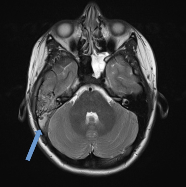 A 12-year-old girl with history of juvenile idiopathic arthritis, MRSA cellulitis and osteomyelitis, and rheumatic fever on chronic penicillin prophylaxis presented to the emergency department with progressive symptoms of otorrhea, right face and neck pain, and decreased hearing concerning for mastoiditis. Seven days prior, the patient was treated with a dose of intramuscular ceftriaxone and a seven-day course of cefdinir at an outside hospital for ear pain and suspected AOM. Despite antibiotic adherence, her symptoms progressed, and she presented to another outside provider who administered additional ceftriaxone and changed her oral antibiotic to trimethoprim-sulfamethoxazole, given her susceptibility to MRSA. Ten days following her initial symptoms, she presented to the ED reporting right-sided hearing loss, otorrhea, pre-syncope, decreased appetite and fatigue.