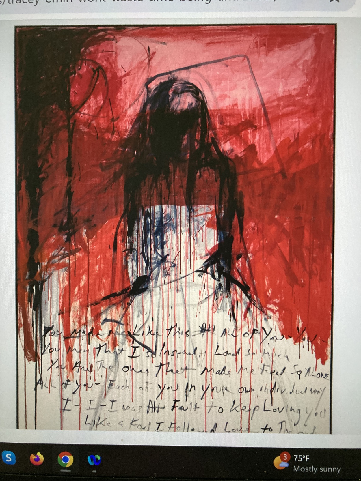 The poem below describes the artwork of contemporary British artist Dame Tracey Emin (b. 1963). Born in Croydon, a district of south London, and raised in the seaside town of Margate, Kent, Emin is known for her dynamic and autobiographical artwork. She produces in a variety of media, including drawing, painting, sculpture, film, photography, neon text, and sewn applique.