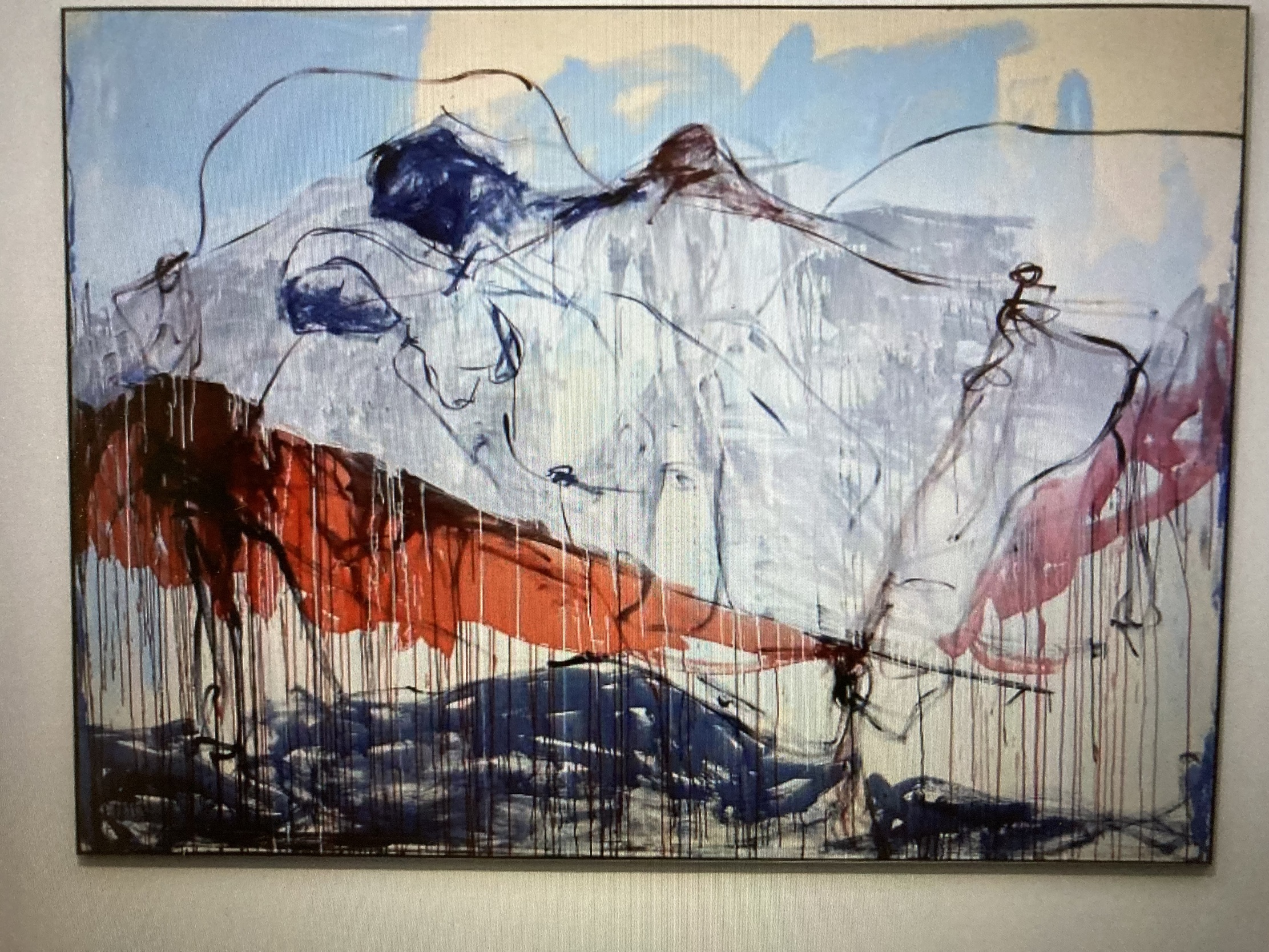 In the beginning of the poem, the speaker makes reference to Emin’s painting, I Followed You to the End (2024), a work recently acquired by the Yale Center for British Art. In the second stanza, the speaker describes Emin’s painting The Saddest Tomb as “a sickbed in a swath of / blue below it as if engulfed by waves, / unreachable in the kingdom of the ill.”